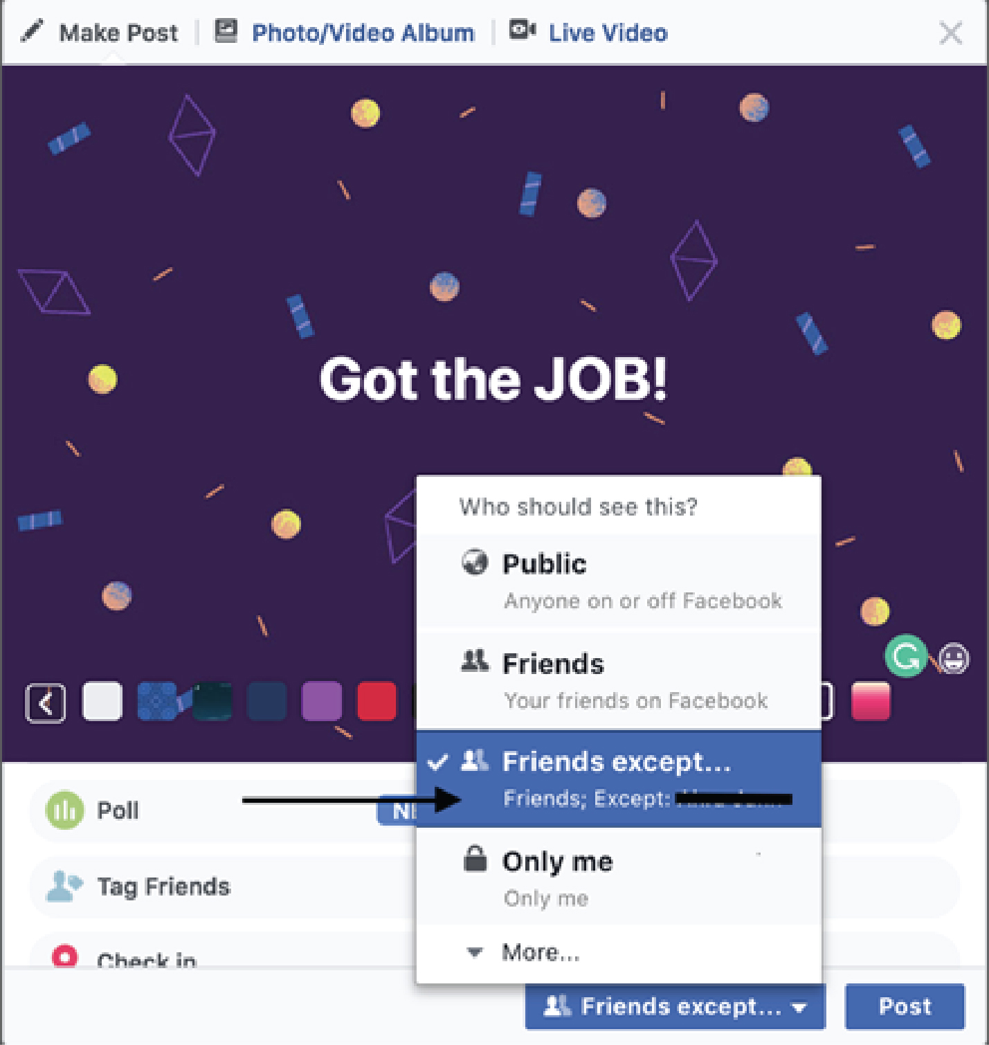 Scenario 1: You were scouting around for a better job and you finally got an interview, or even better, you got THE job. You want to share it with your friends and family about this great news, but you’re friends with your current boss on Facebook. And you really, really want to write a Facebook status update. How do you do that without your boss seeing it?