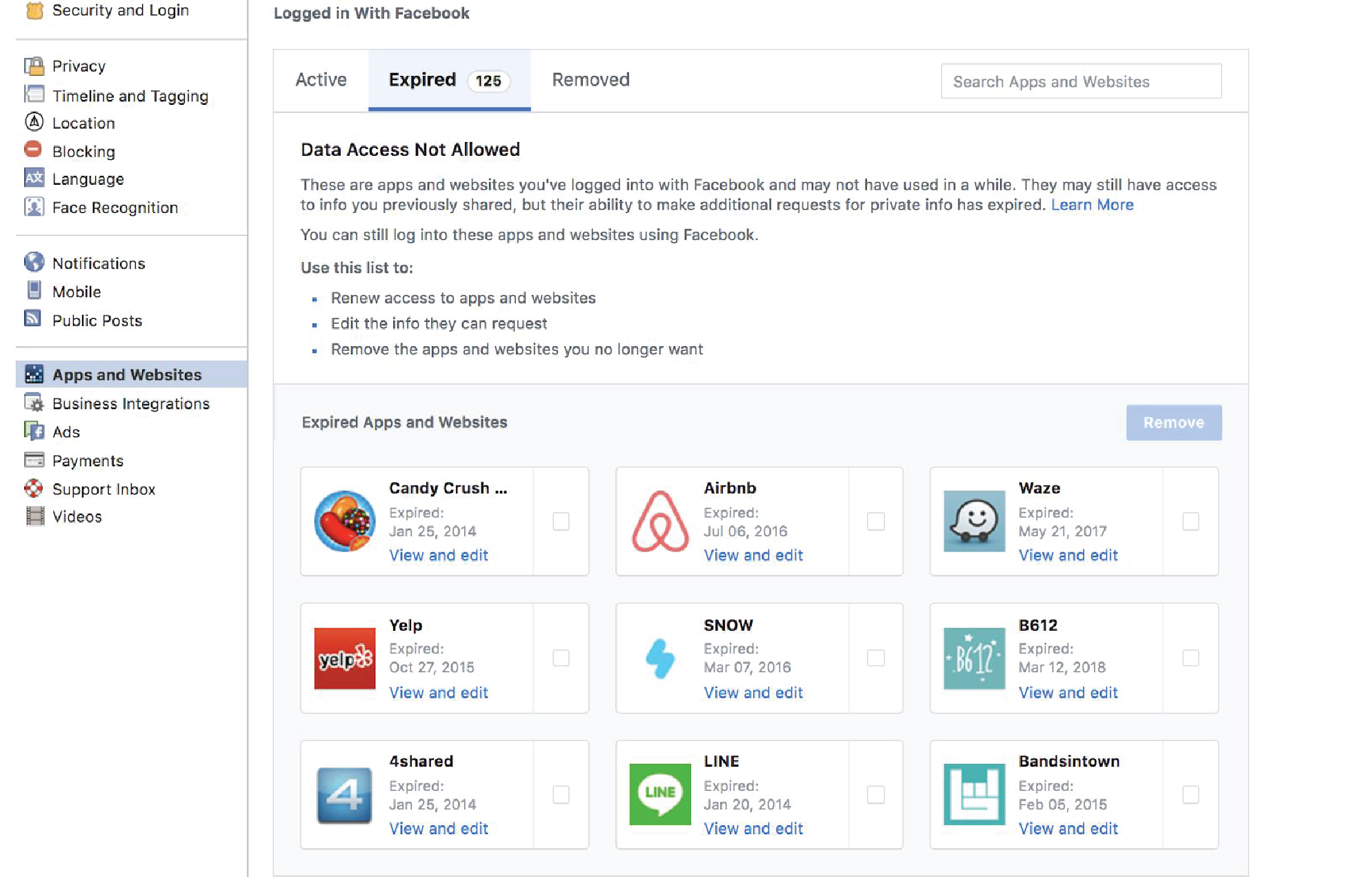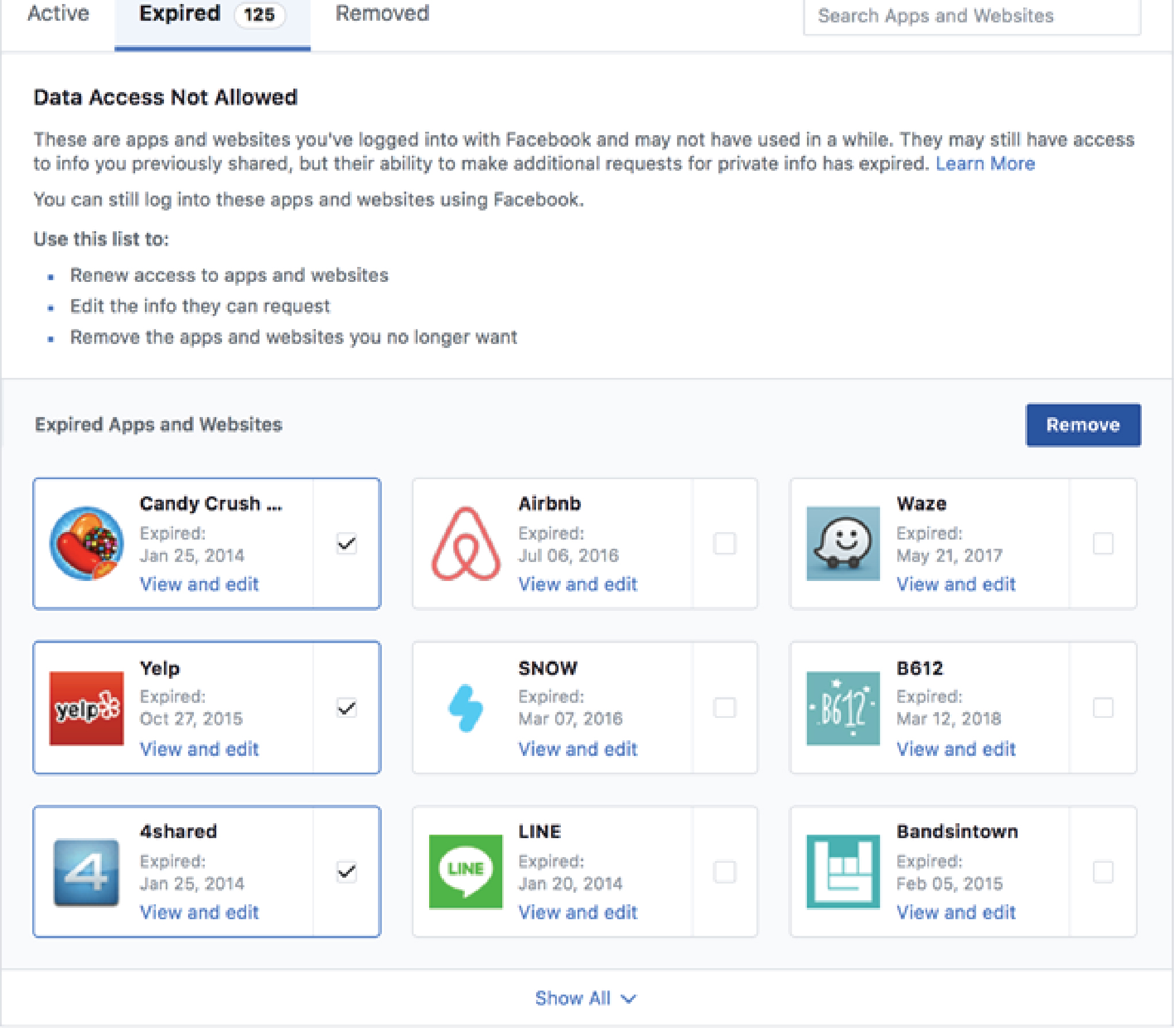You’ll see the list of apps that you’ve had linked with your Facebook account- actively, expired or has been removed.