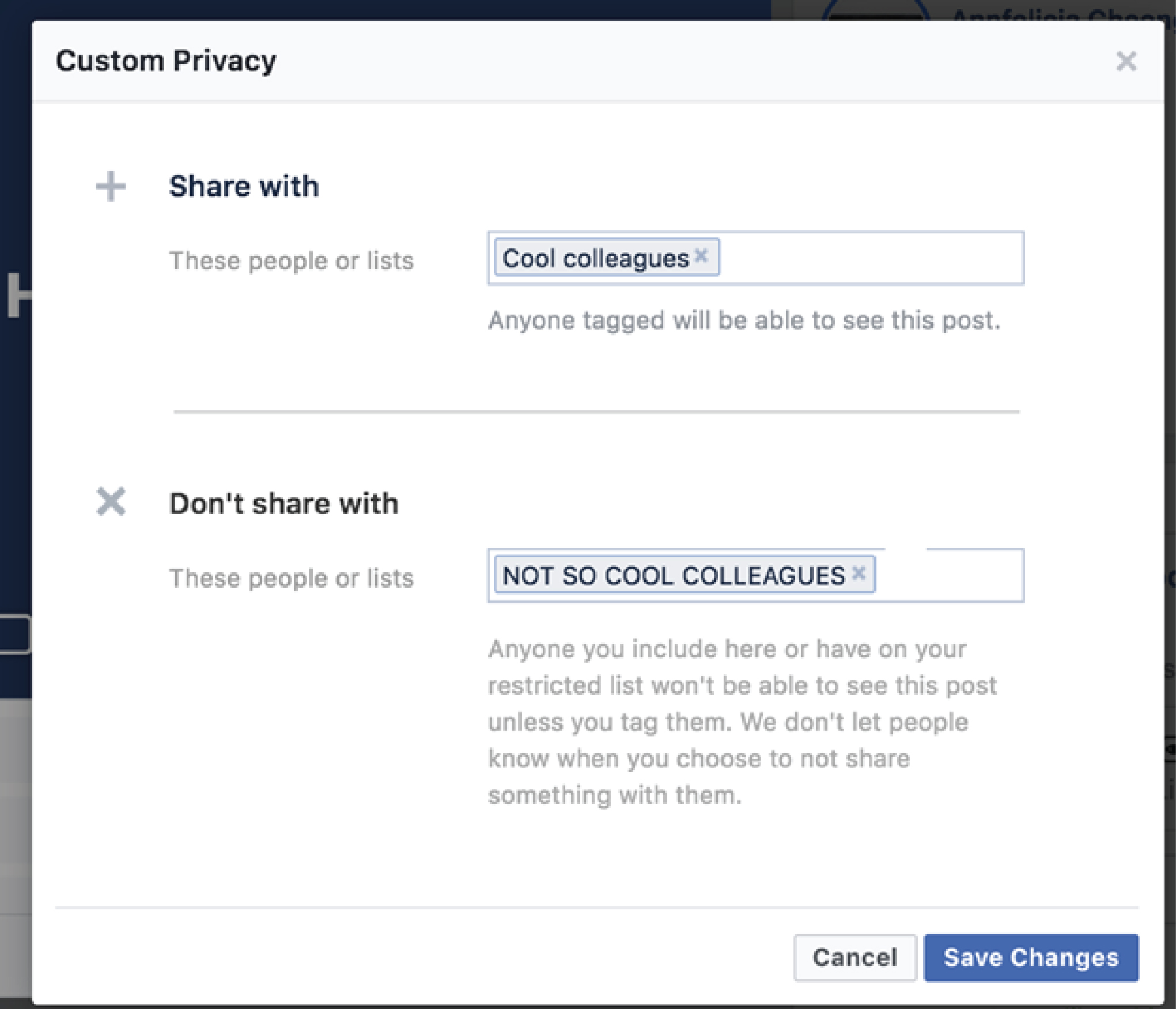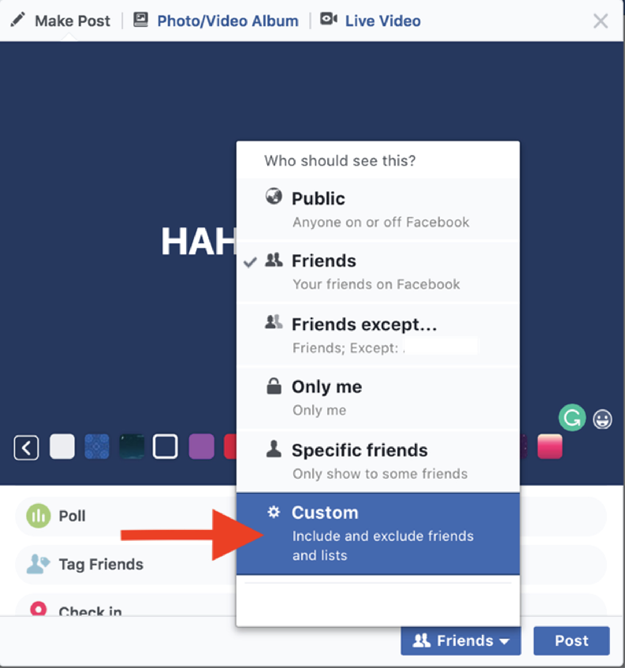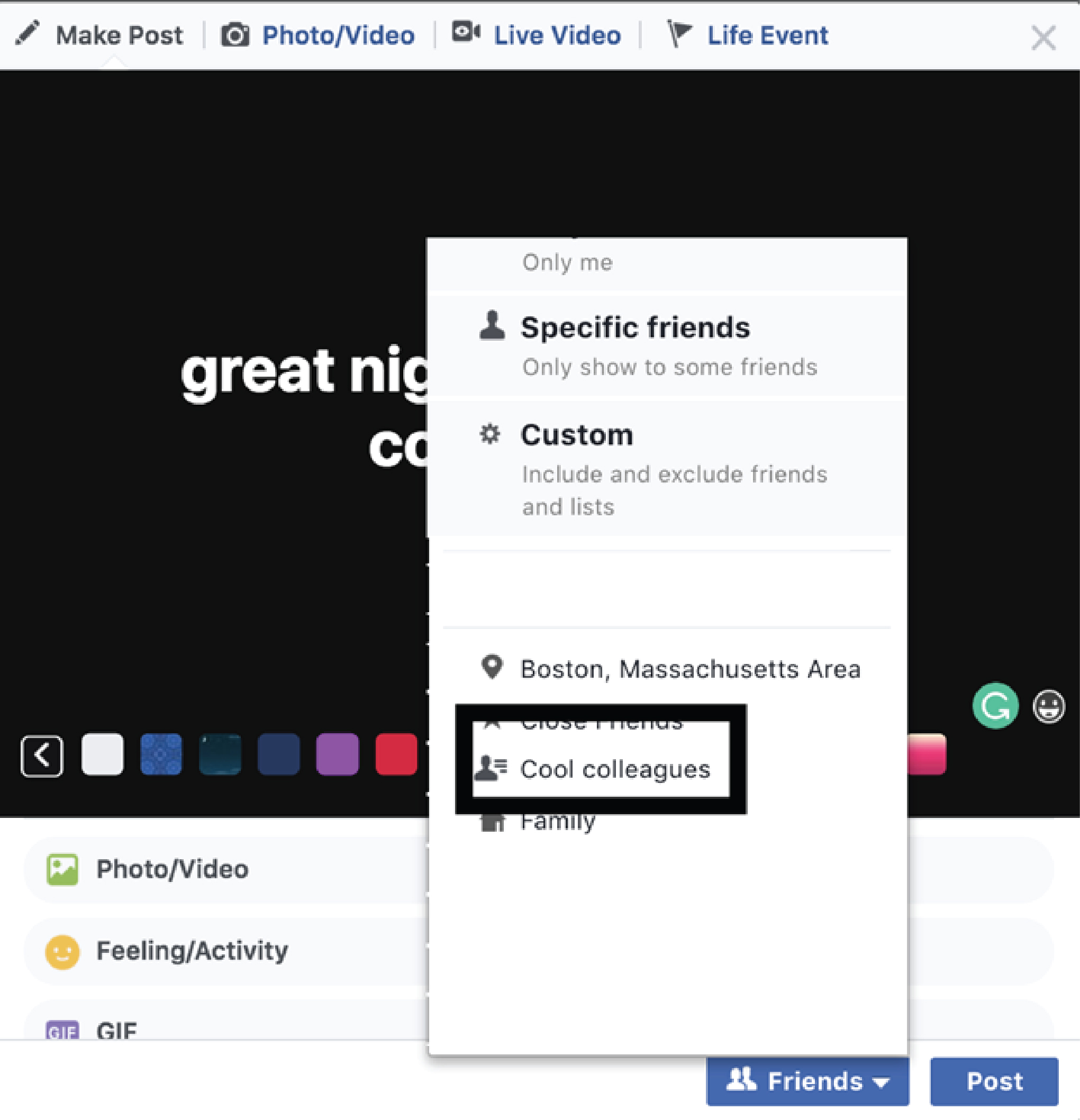 Scenario 2: You and a few other colleagues went out to have some drinks, did some outdoor activities together, etc. except you didn’t invite that other few colleagues that annoy you. But you want to post pictures of you and your non-annoying colleagues hanging out. Here’s what you can do if you hang out with these few colleagues occasionally, create a friend list which you can group them up.